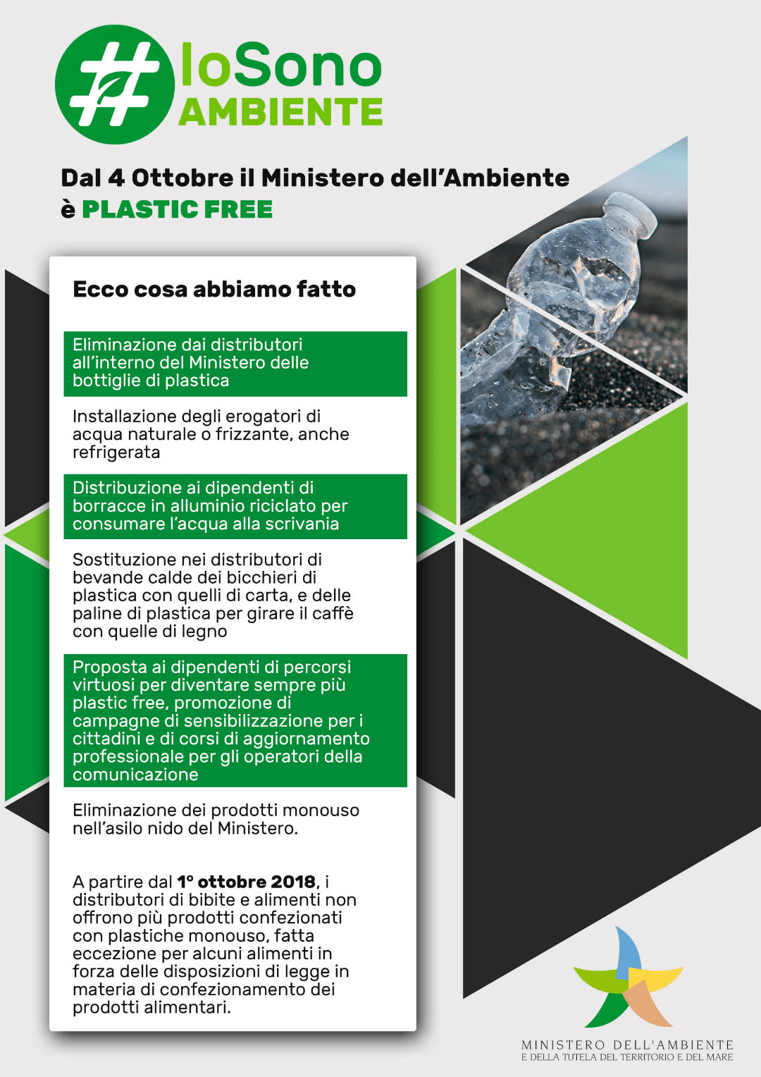 Non solo, il Ministero dell’Ambiente da fine 2018 ha avviato il progetto “Io sono Ambiente” volto alla diffusione della cultura “plastic free”, sollecitando inoltre tutte le amministrazioni pubbliche affinchè siano da esempio ai cittadini.